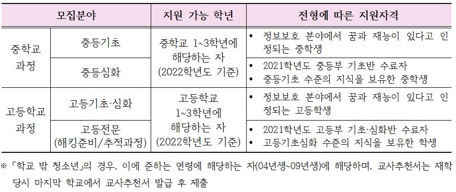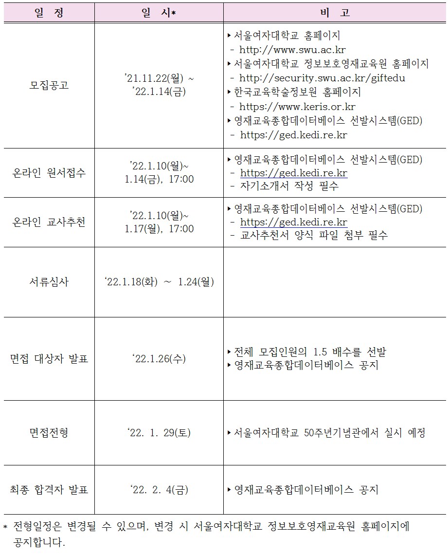 입시요강 [대학부설] 2022학년도 서울여자대학교 정보보호영재교육원 입학전형