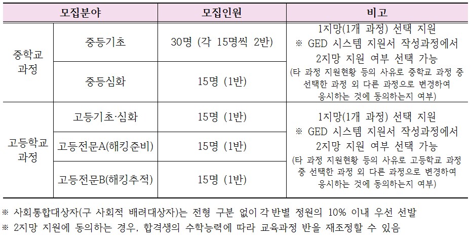 서울여자대학교 정보보호영재교육원의 경우 1권역(서울, 인천, 경기, 강원 지역) 및 제주도에 거주하는 2022학년도 기준 중학생(1, 2, 3학년) 및 고등학생(1, 2, 3학년)이면 지원이 가능합니다. (단, 제주 거주 학생은 권역에 관계없이 지원가능합니다.)