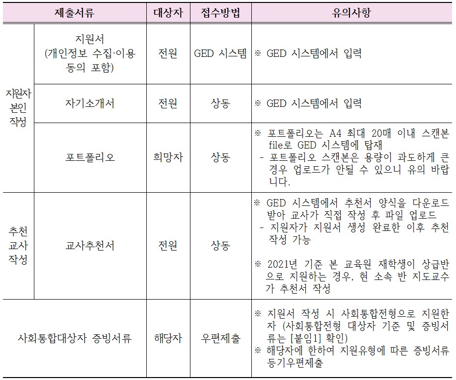 다른 세 정보보호영재교육원이 12월에 말부터 원서접수를 시작한 반면에 서울여자대학교 정보보호영재교육원은 1월 10일(월)부터 1월 14일(금)까지 단 5일간만 GED를 통해 지원하며, 제출한 서류를 평가하여 면접대상자(모집인원의 1.5배수)를 선정합니다. 면접은 1월 29일(토)로 이는 2권역의 건양대학교 정보보호영재교육원만 일정이 상이합니다.