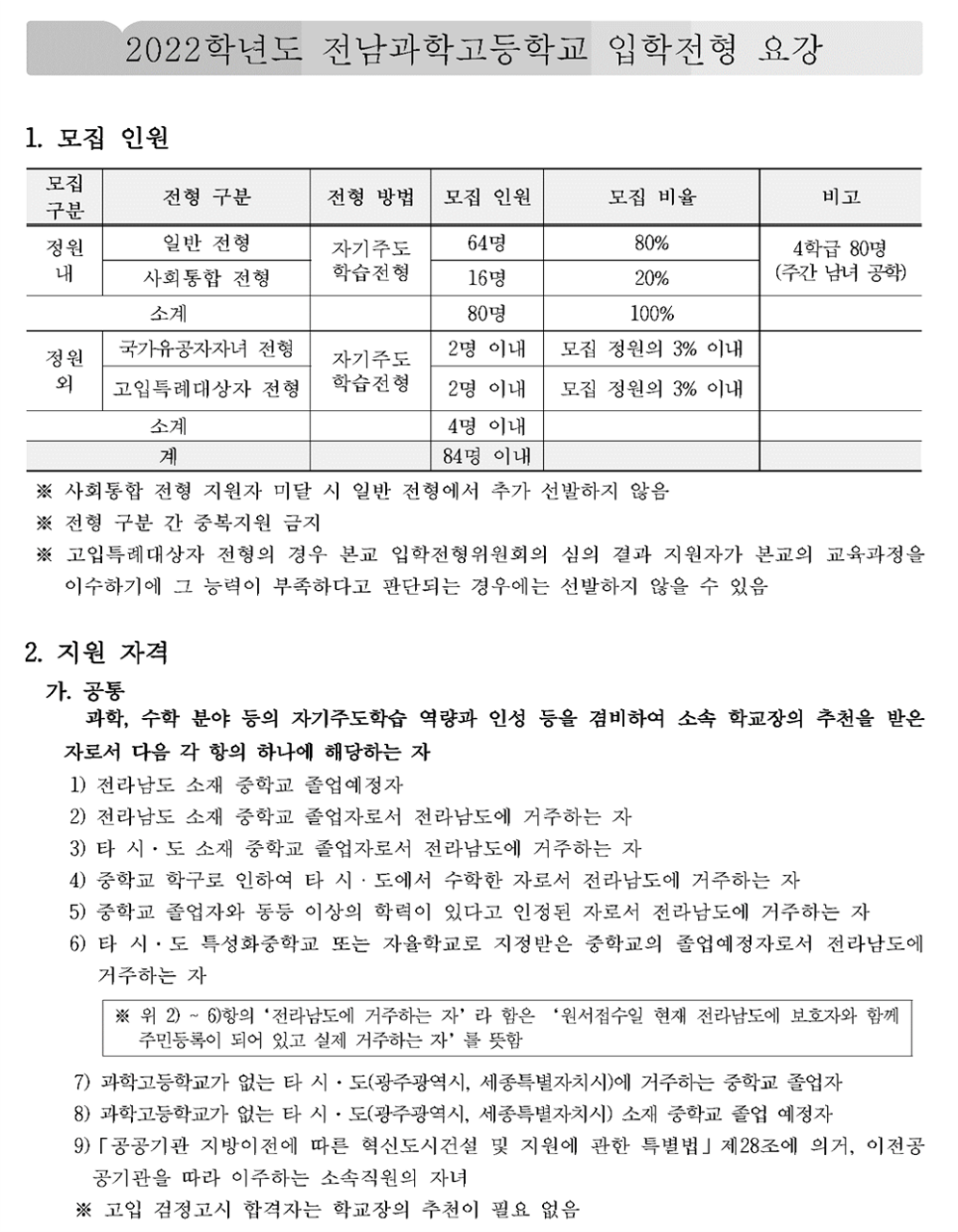 2022학년도 전남과학고 입학전형