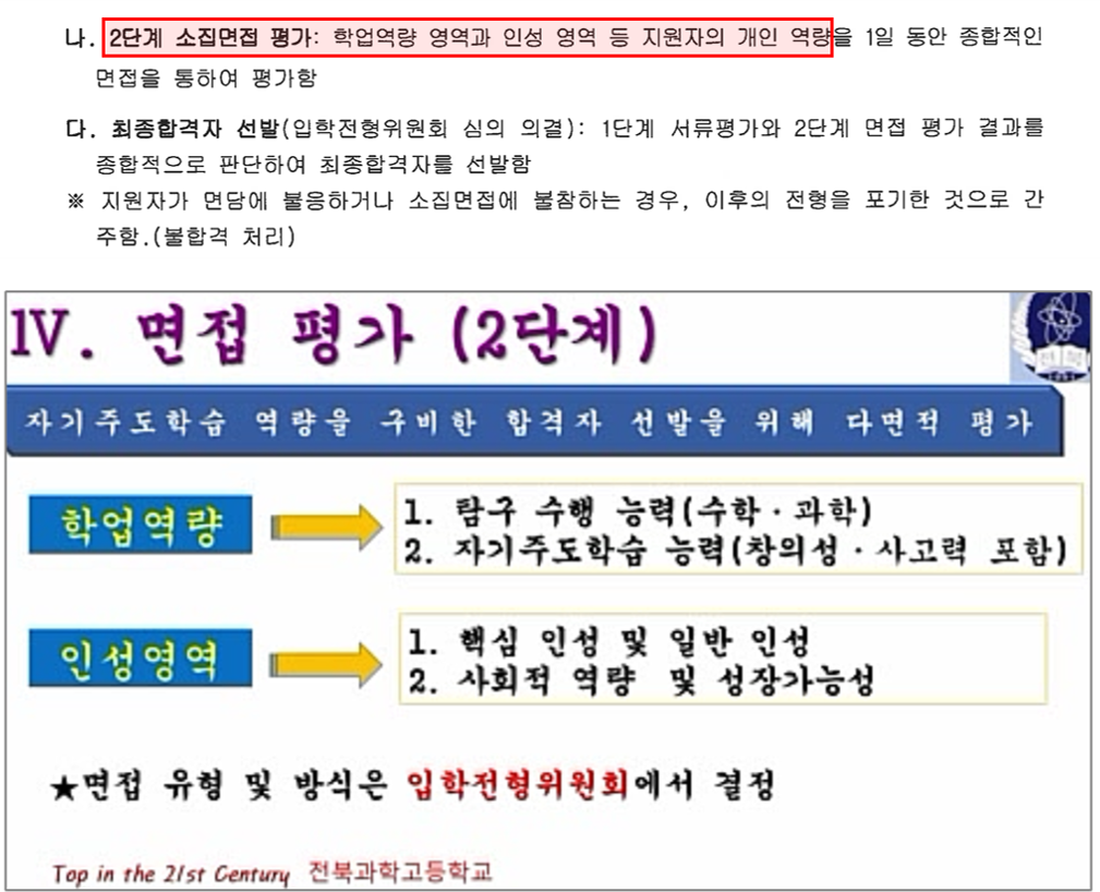 전북과고는 1단계에서 서류평가와 면담을 통해 2배수 이내의 인원을 선발하고, 2단계에서 면접평가를 실시해 합격자를 정한다. 서류평가에서는 학생부, 자소서, 추천서를 바탕으로 자기주도 학습능력, 잠재력, 인성 등을 종합평가한다. 2단계 소집면접에선 학업역량 영역과 인성 영역 등 지원자의 개인역량을 하루 동안 종합정인 면접을 통해 평가한다. 내신 반영은 3학년1학기까지 최근 3개학기 성적을 반영한다. 학기별 반영비율은 최근 학기부터 각 50%, 30%, 20%다.