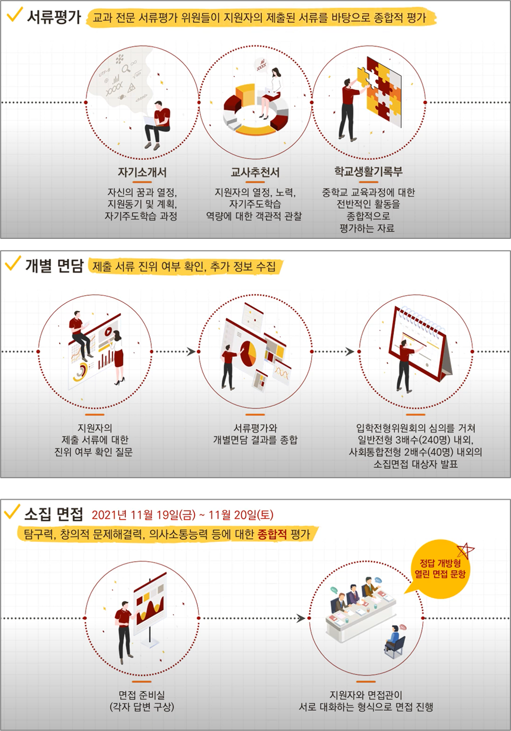 경기북과학고는 기존에 유지해오던 3단계 전형을 올해 2단계로 축소했다. 1단계 서류평가에서 학생부/자소서/추천서/소집면담을 평가해 모집정원의 3배수 내외(사회통합전형은 2배수)를 선발한다. 2단계는 면접평가로 수학/과학 창의성 자기주도학습 역량, 인성 등을 종합적으로 평가하는 융합형 과제를 제시한다. 최종합격자는 서류평가와 면접 결과를 종합해 결정한다.